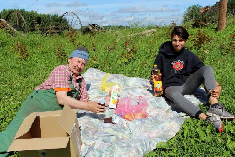Na een zaterdagochtend in de buitenlucht werken, is het goed om even samen met een van de helpende jongens uit een sponsorgezin te lunchen.